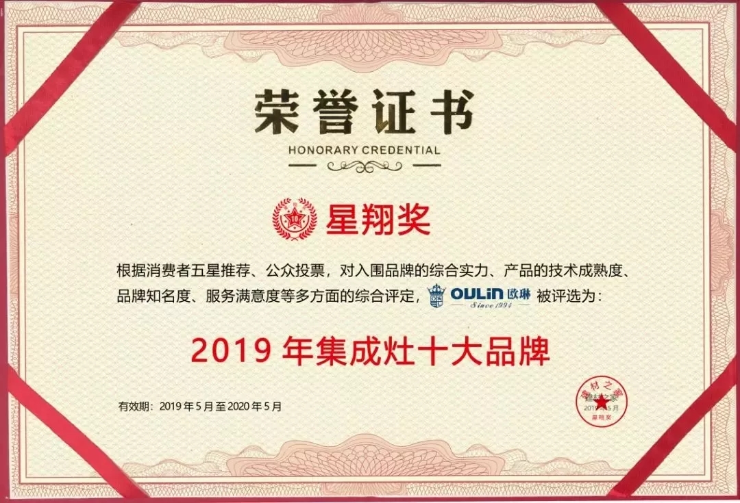 2019年5月,歐琳集成灶榮膺星翔獎“2019建材之家集成灶十大品牌”稱號。