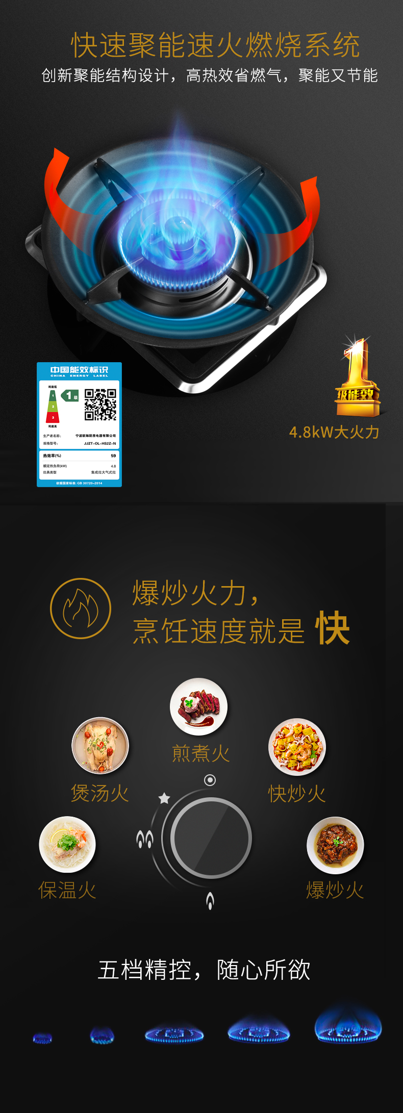 保溫火、煲湯火、煎煮火、快炒火、爆炒火,五檔火力隨心調節,讓廚藝不受火力限制。
