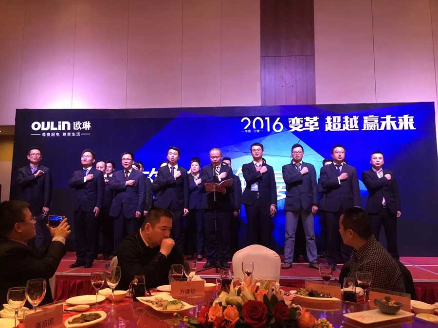 在2015年倒計(jì)時(shí)23天的時(shí)候, OULIN歐琳廚電公司2015年度核心經(jīng)銷商大會,在寧波東錢湖恒元酒店隆重召開,OULIN歐琳集團(tuán)總裁徐劍光、副總裁謝忠定、集團(tuán)市場總監(jiān)李柏強(qiáng)、廚電事業(yè)部總經(jīng)理陳四海及全國100余位新老經(jīng)銷商朋友悉數(shù)到會。會議以“變革 超越 贏未來”為主題,分析在廚電大市場環(huán)境與趨勢,謀定2016年OULIN歐琳廚電的發(fā)展方向與策略。