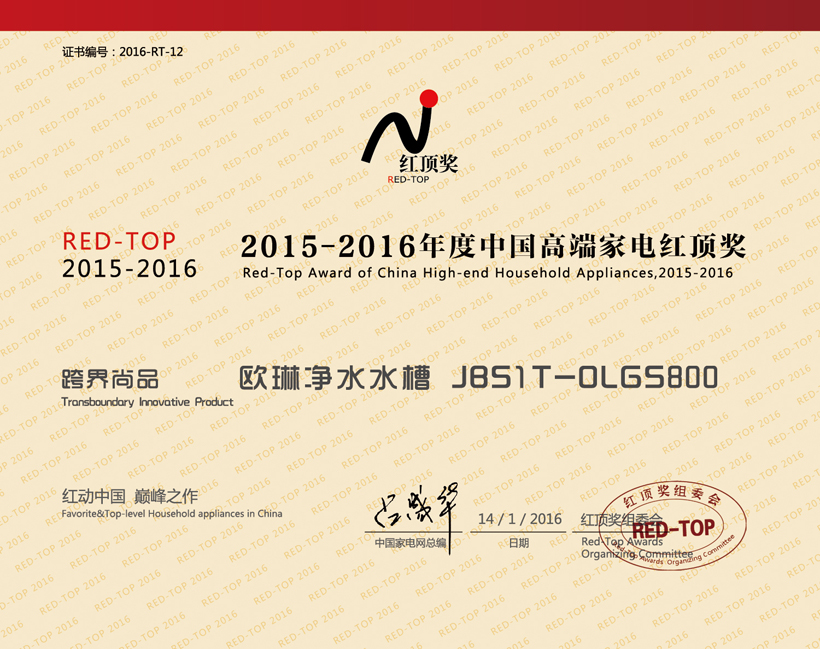 2016開年,歐琳“凈水水槽”又憑借水槽電器化、智能化的創新,與三星、西門子家電等國際品牌一起,榮獲第七屆中國高端家電“紅頂獎”,這也是歐琳2016開門紅第一獎。